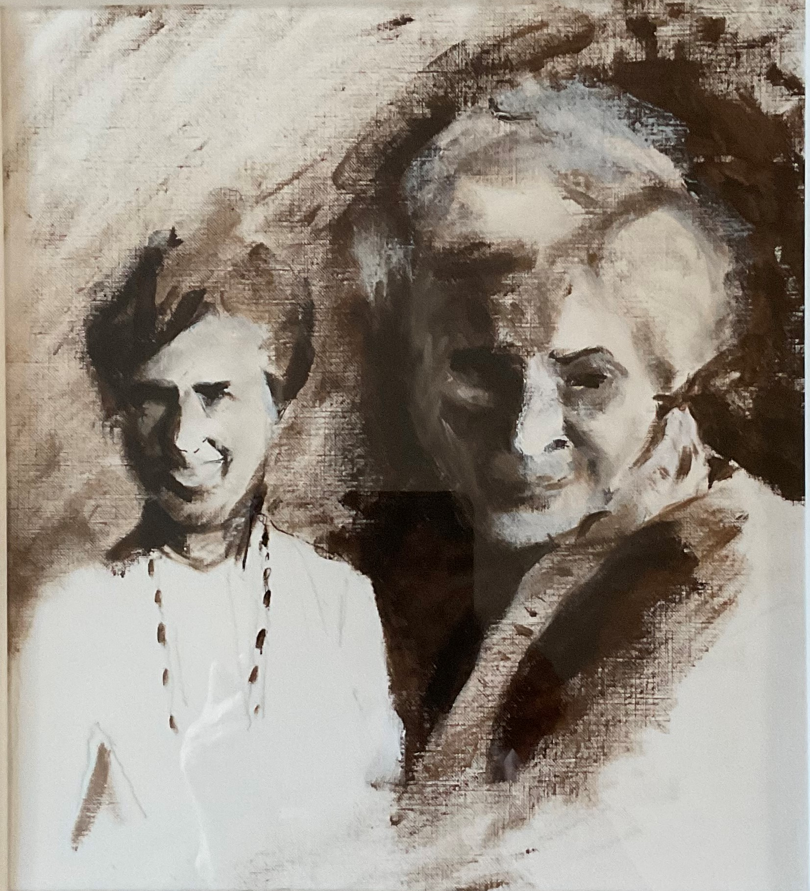 Dubbelportret van mijn moeder, 45 en 90 jaar. Acryl van Dijckbruin, 34 x 31 cm. Particulier bezit.