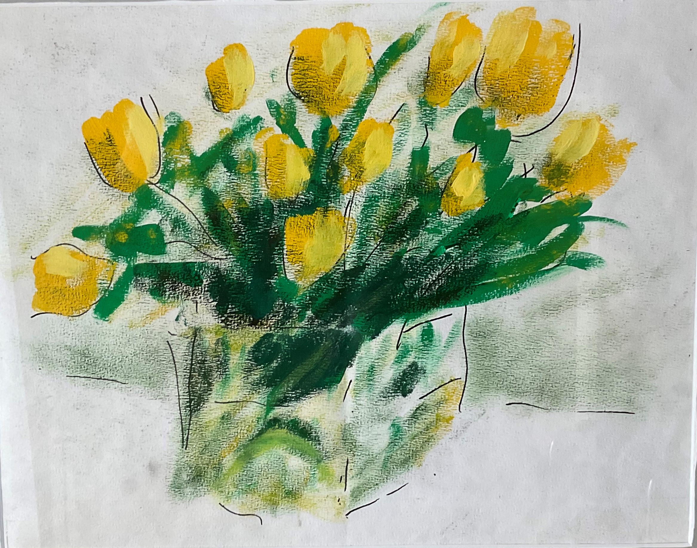 Gele tulpen, 2021. Fineliner en plakkaatverf op papier, 42,5 x 32,5 cm.