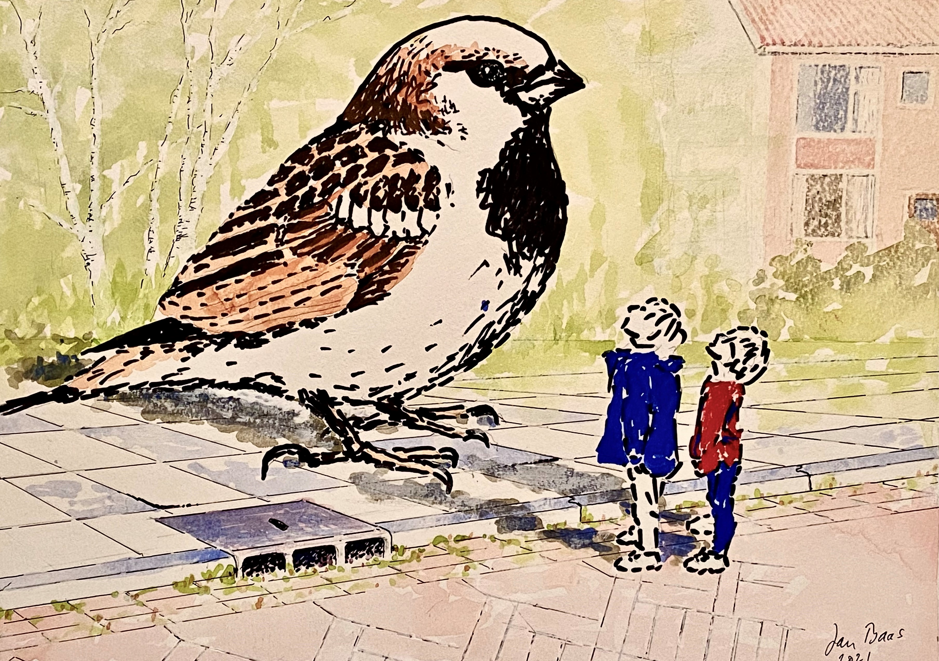 De grote mus en de jongetjes, 2021. Viltstift, fineliner en plakkaatverf op papier op hardboard, 48 x 36 c. Particulier bezit.