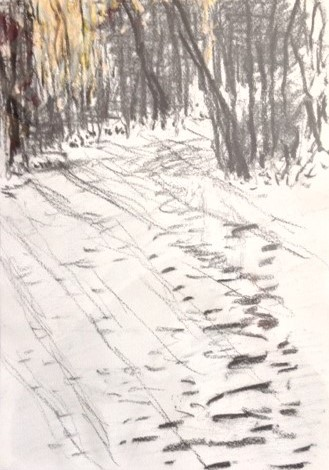 Sneeuw op de Hoge Dijk bij Abcoude, 2021. Houtskool op papier, 30 x 21 cm. Particulier bezit.