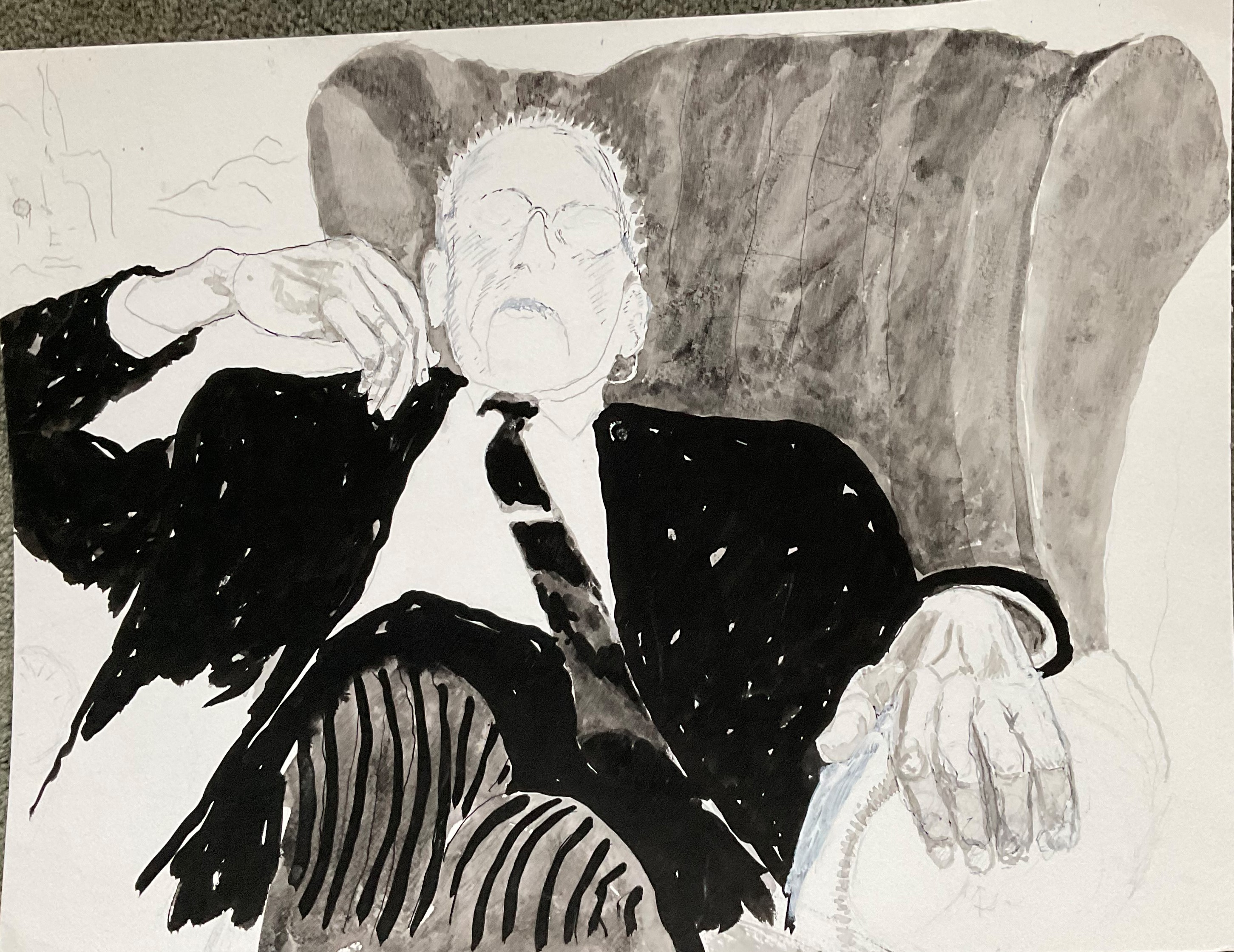 Mijn vader in zijn zetel op zijn 95e, 2016. (Gewassen) Oost-Indische inkt, 75 x 60 cm.