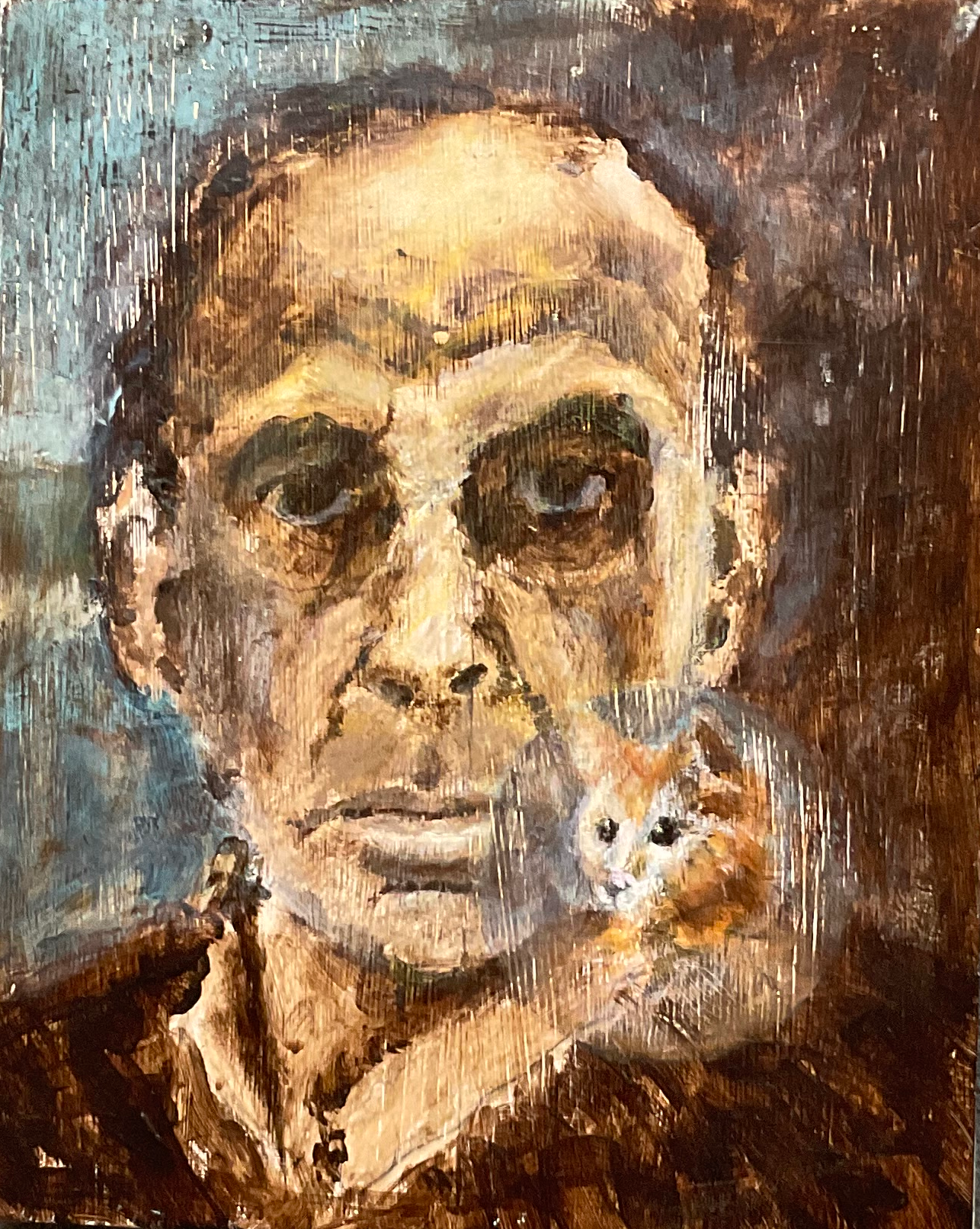 Zelfportret met kat in 1944, 2018. Acryl op hout, 31 x 25,5.